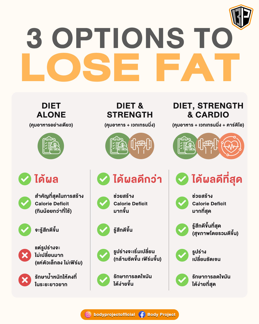 • คุมอาหาร + เวทเทรนนิ่ง + คาร์ดิโอ = ทางเลือกที่ดีที่สุด ช่วยให้ร่างกายแข็งแรงขึ้นทั้งภายใน และภายนอกเห็นผลไวขึ้น สุขภาพดีขึ้น และรักษาน้ำหนักได้ระยะยาว
