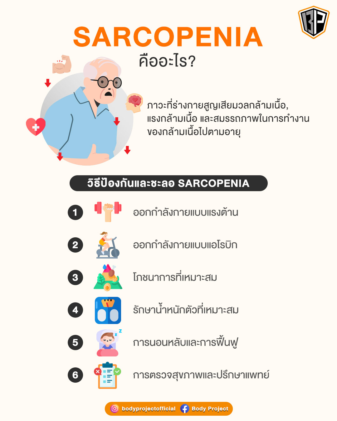 Sarcopenia (ภาวะมวลกล้ามเนื้อลดลงตามอายุ) คือภาวะที่ร่างกายสูญเสียมวลกล้ามเนื้อ, แรงกล้ามเนื้อ และสมรรถภาพในการทำงานของกล้ามเนื้อไปตามอายุ โดยมักเริ่มเกิดตั้งแต่อายุประมาณ 30 ปีขึ้นไป และจะชัดเจนขึ้นหลังอายุ 50–60 ปีขึ้นไป ภาวะนี้ส่งผลให้ร่างกายอ่อนแรง เคลื่อนไหวช้าลง สมดุลแย่ลง เสี่ยงหกล้ม และมีผลต่อสุขภาพโดยรวม เช่น การเผาผลาญลดลง เสี่ยงโรคเบาหวาน ความดัน และโรคเมตาบอลิกต่างๆ